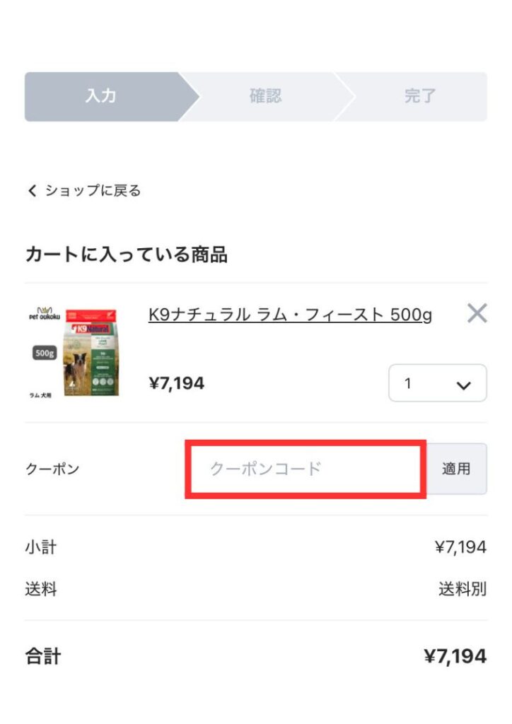 ②クーポンコード入力欄に一覧からコピーしたコードを入力後、適用させてください。
